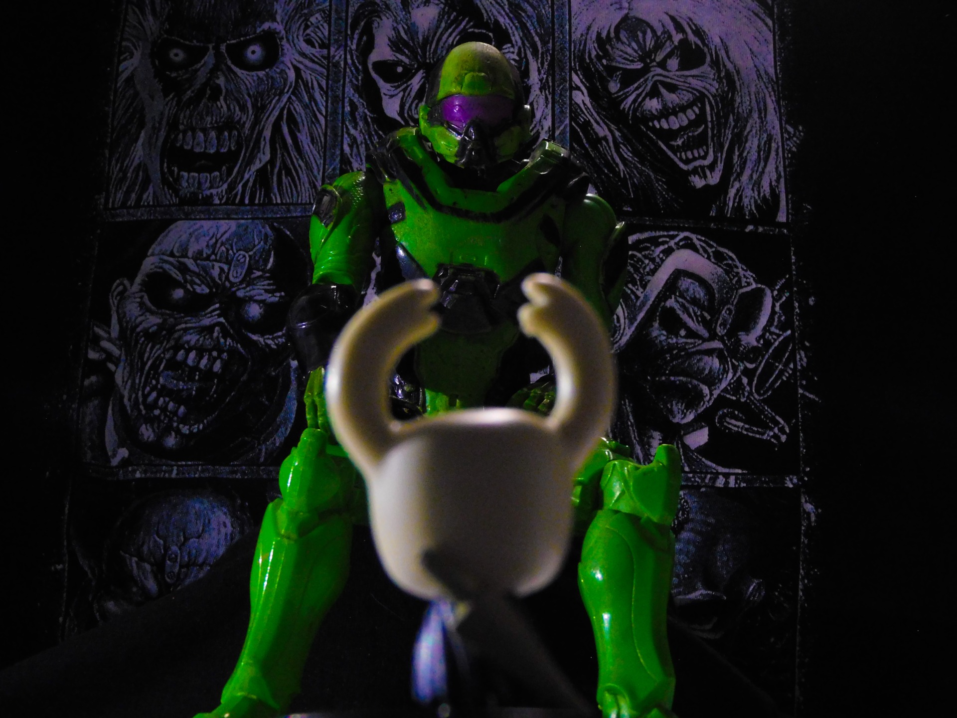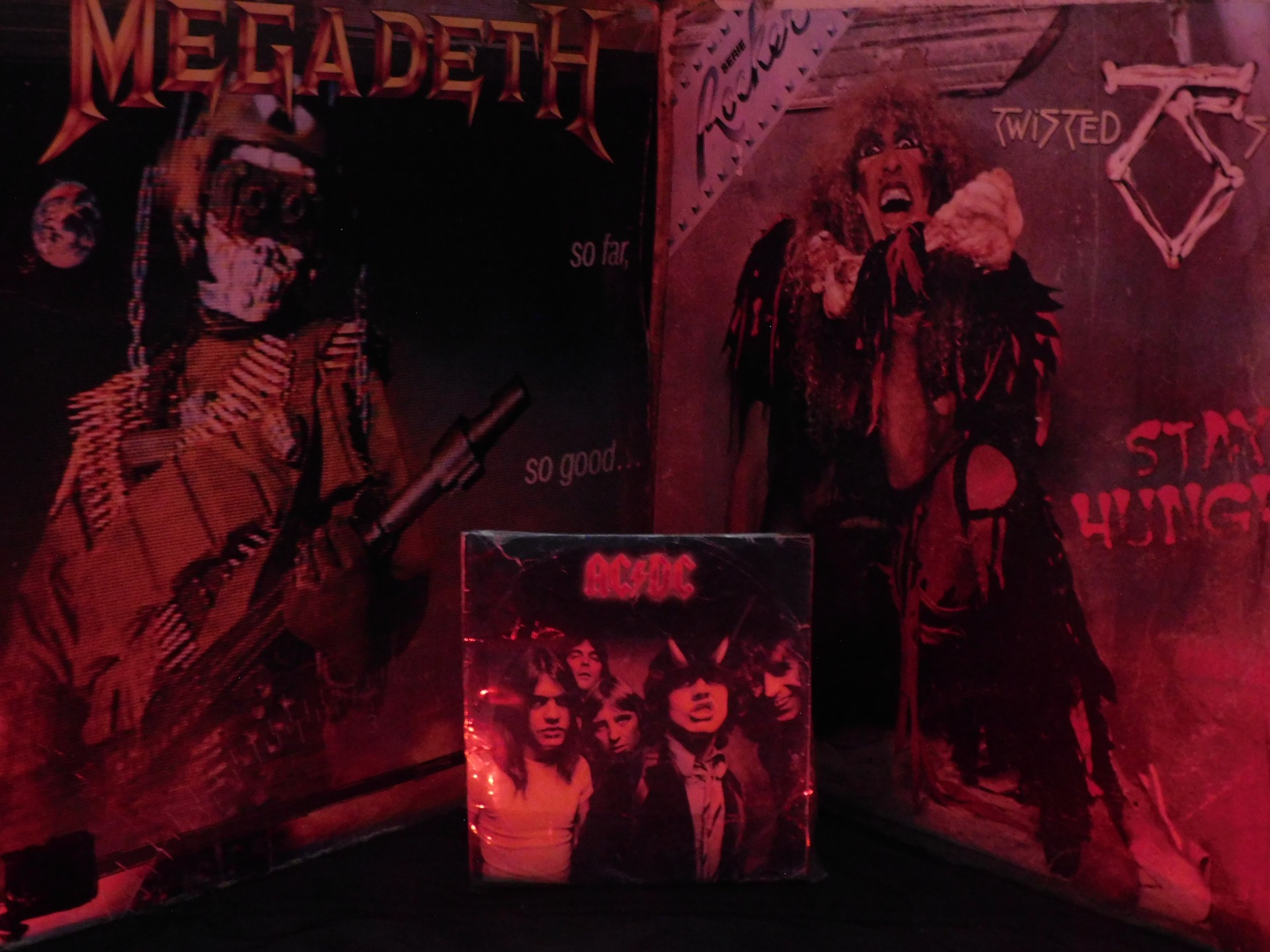 Tres álbumes de rock colocados estratégicamente forman una triada visual equilibrada y llena de personalidad.