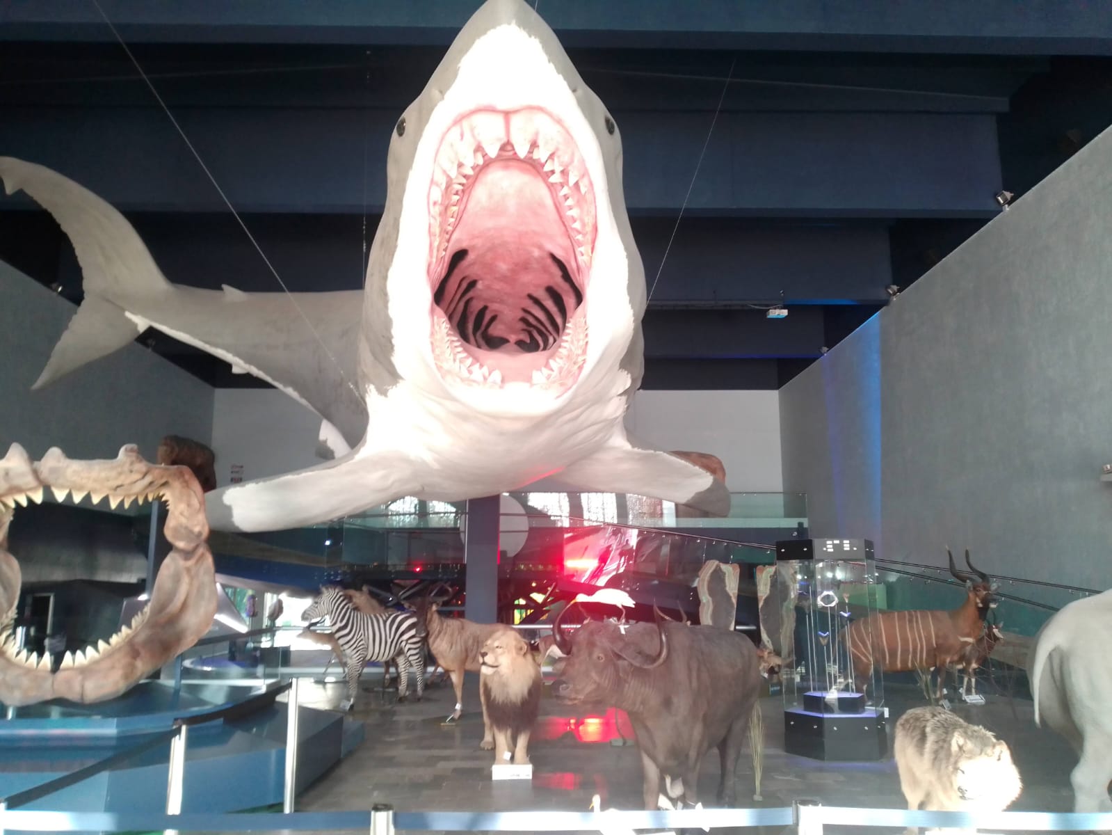 Dentro del museo, varios animales se exhiben, pero el gran tiburón roba todas las miradas. Su presencia impone.