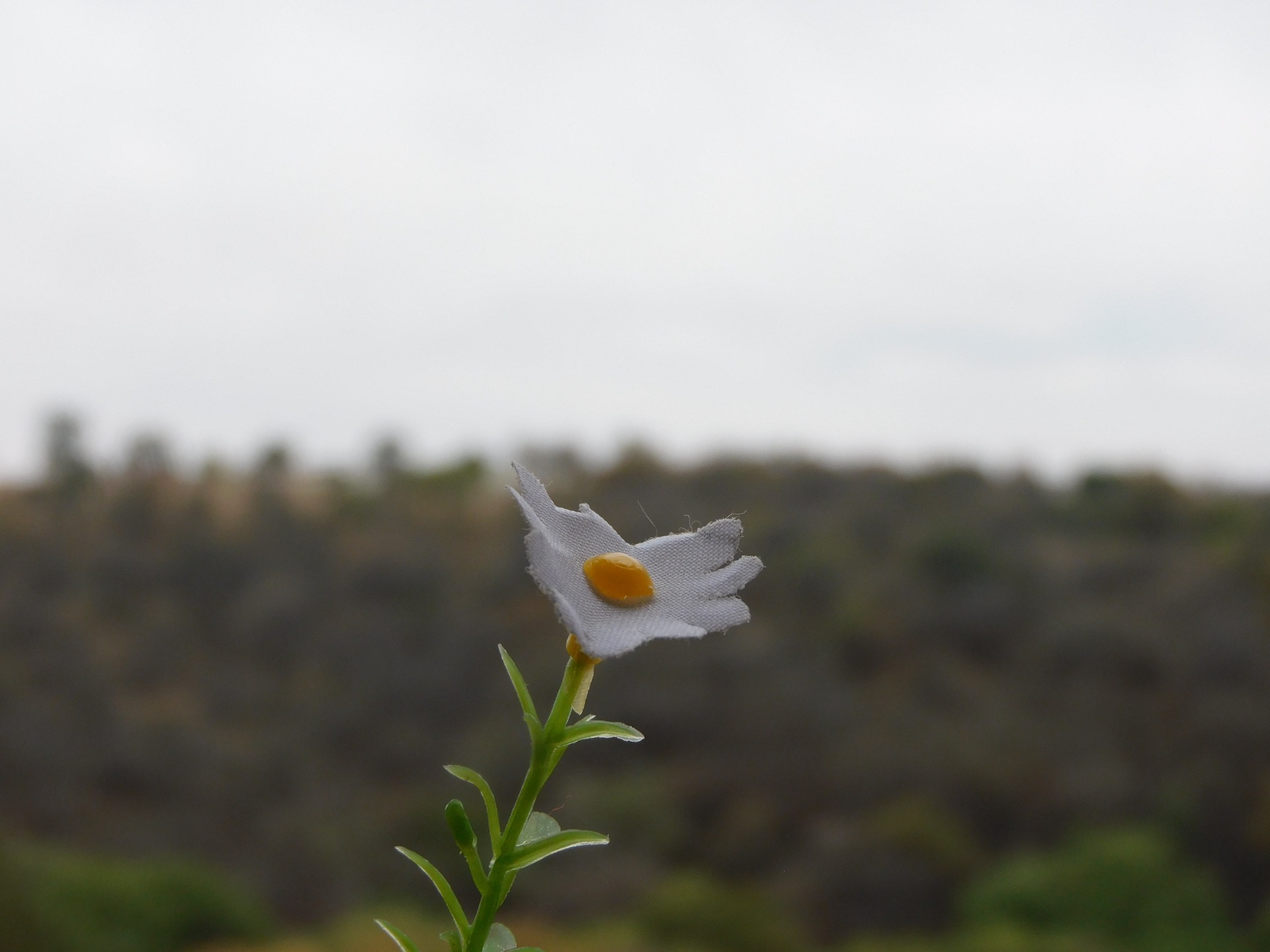 Una margarita en primer plano destaca con fuerza frente a un fondo de árboles borrosos y un cielo nublado. Simple y poderosa.