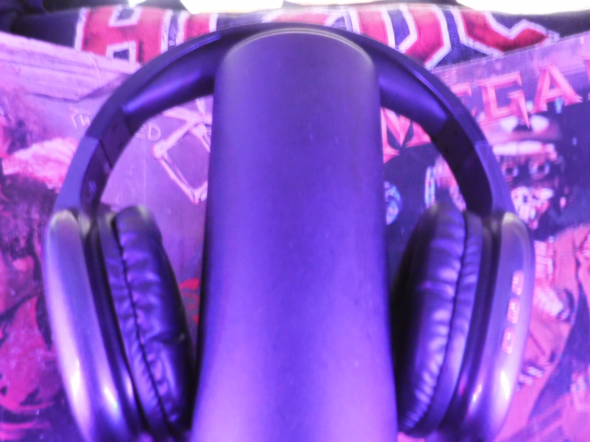 Unos audífonos grandes, apoyados sobre una base, se ven desde un ángulo contrapicado. Al fondo, algunos álbumes de rock desenfocados completan la atmósfera musical.