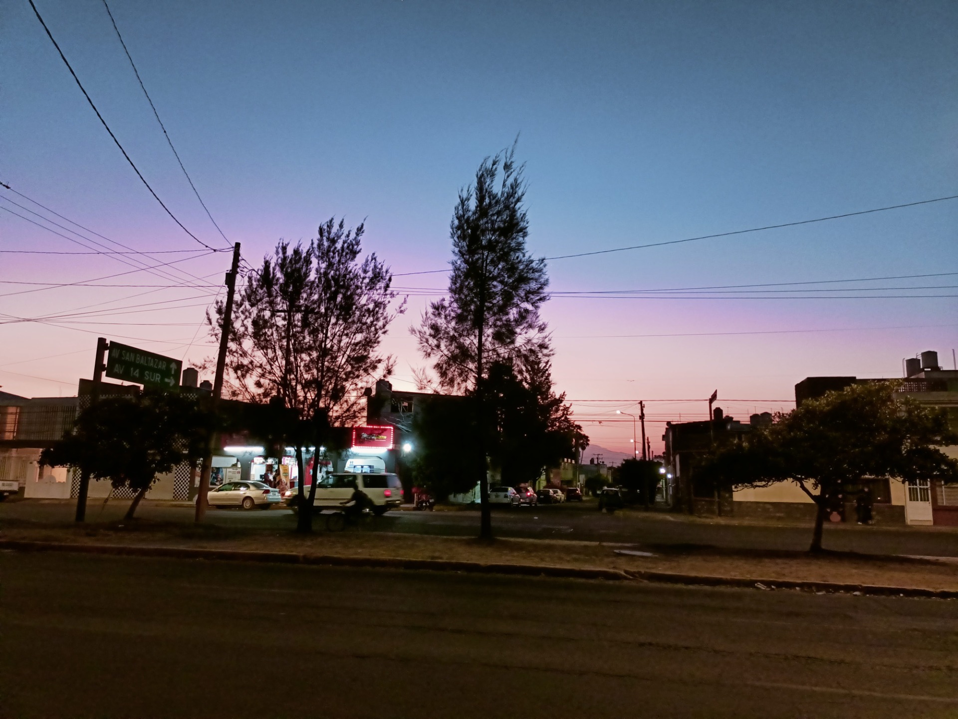 Carretera acompañada de árboles dispersos. El atardecer pinta el cielo con rosas tenues que se desvanecen mientras el azul lo consume.