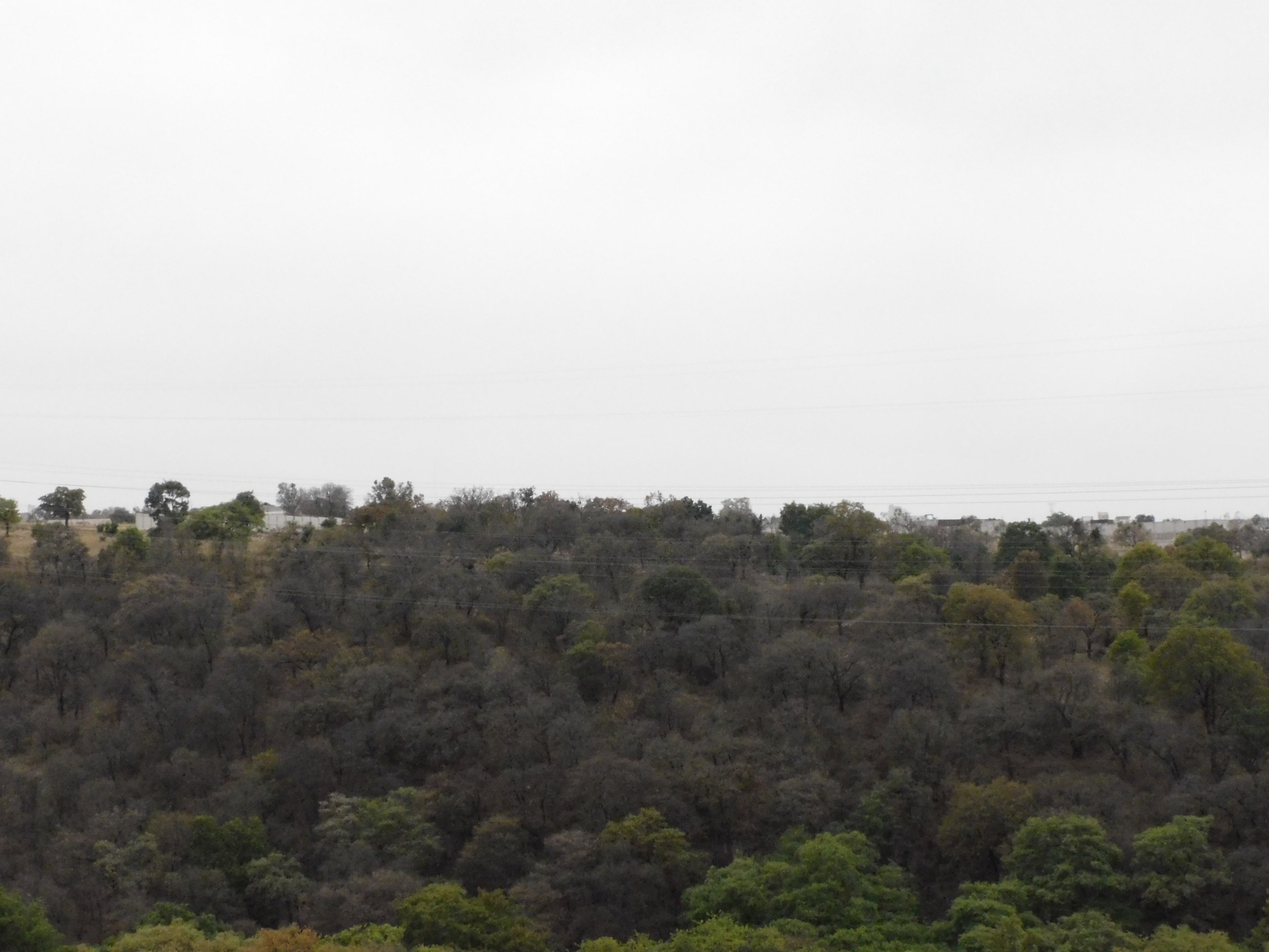 Una mañana gris donde el cielo nublado y los árboles marcan una separación entre el mundo vegetal y el cielo apagado.